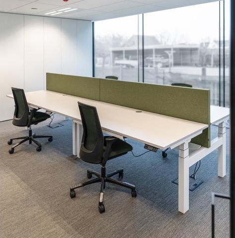 Volledig uitgeruste werkplek voorzien van zit/sta bureaus met ergonomische bureaustoelen.